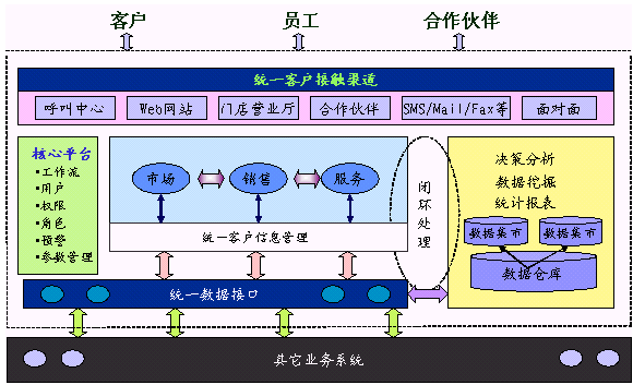 HOLLYCRM(合力金橋軟件公司)推出的HollyCRM是全面集成的客戶關(guān)系管理解決方案,覆蓋協(xié)作型CRM、運(yùn)營(yíng)型CRM和分析型CRM的全部范疇。HollyCRM通過(guò)telephone、Email、Fax、WAP、Web、PDA、Face to Face等各種各樣渠道與客戶互動(dòng),通過(guò)市場(chǎng)營(yíng)銷(Marketing)、銷售(Sales)和服務(wù)(Service)等業(yè)務(wù)流程的管理,將客戶的各種背景信息、偏好、行為習(xí)慣、交易數(shù)據(jù)、信用狀況等信息收集并整合在一起,再將這些運(yùn)營(yíng)數(shù)據(jù)和外來(lái)的市場(chǎng)數(shù)據(jù)經(jīng)過(guò)整合和變換,裝載進(jìn)數(shù)據(jù)倉(cāng)庫(kù)(Data Warehouse)后,運(yùn)用OLAP和數(shù)據(jù)挖掘(Data Mining)等技術(shù)來(lái)從數(shù)據(jù)中分析和提取相關(guān)規(guī)律、模型和趨勢(shì),把有關(guān)客戶信息和知識(shí)在整個(gè)企業(yè)內(nèi)得到有效的流轉(zhuǎn)和共享,并進(jìn)一步轉(zhuǎn)化為企業(yè)的戰(zhàn)略規(guī)劃和科學(xué)決策,用于提高在所有渠道上同客戶交互的有效性和針對(duì)性,把合適的產(chǎn)品和服務(wù),通過(guò)合適的渠道,在適當(dāng)?shù)臅r(shí)候,提供給適當(dāng)?shù)目蛻,從而?shí)現(xiàn)利潤(rùn)的最大化。