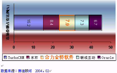2004年2月10日,北京。賽迪顧問(CCID Consulting )在中國大飯店隆重舉辦了"2004IT市場年會", 會上發(fā)布了《2003-2004年中國管理軟件產(chǎn)業(yè)投資機(jī)會研究年度報告》。HOLLYCRM(合力金橋軟件)公司在強(qiáng)手如林的評選中憑借其強(qiáng)勁的市場占有份額、深厚的品牌實(shí)力及出眾的用戶美譽(yù)度無可爭議地穩(wěn)居2003年度中國CRM軟件整體市場份額前三甲, 同時更奪得了2003年度中國電信行業(yè)CRM市場份額龍頭位置。
