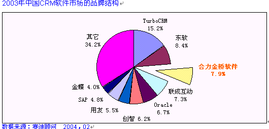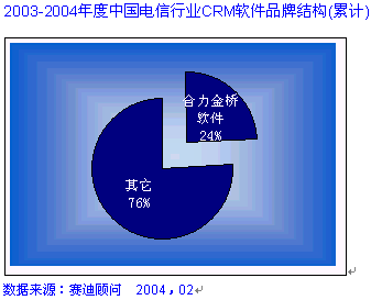 HOLLYCRM(合力金橋軟件)公司作為實(shí)力卓越的CRM主流廠商, 致力于提供最專業(yè)化的應(yīng)用軟件和服務(wù),提供以客戶為核心的信息化解決方案,服務(wù)領(lǐng)域跨越電信運(yùn)營商、金融業(yè)、制造業(yè)等行業(yè)。在電信行業(yè)的CRM市場中,合力金橋軟件處于穩(wěn)固領(lǐng)先位置, 其推出的客戶關(guān)系管理解決方案,覆蓋協(xié)作型、運(yùn)營型和分析型的全部范疇。在CRM產(chǎn)業(yè)在2003年的中國發(fā)展態(tài)勢整體放緩的大環(huán)境下, HOLLYCRM卻一枝獨(dú)秀, 在不到一年的時間里簽下中國網(wǎng)通總部、天津網(wǎng)通、山西網(wǎng)通、內(nèi)蒙聯(lián)通等大型CRM項目,積累了豐富的CRM項目實(shí)施經(jīng)驗(yàn)。在累計的電信行業(yè)CRM軟件市場中,合力金橋軟件一家占有份額就達(dá)到24%, 合力金橋軟件此次在CCID年度研究報告中倍受矚目可謂眾望所歸, 充分說明了其CRM產(chǎn)品在高端行業(yè)的領(lǐng)軍地位, 如圖: