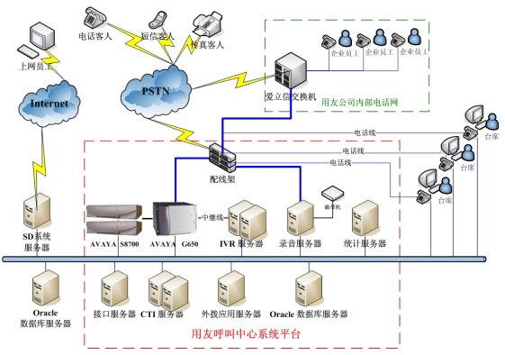 - 完善的業(yè)務(wù)系統(tǒng)整合能力:通過與用友的后臺(tái)SD業(yè)務(wù)系統(tǒng)的集成,實(shí)現(xiàn)了接入系統(tǒng)與后臺(tái)業(yè)務(wù)系統(tǒng)的數(shù)據(jù)共享,使得前臺(tái)呼叫中心接入與后臺(tái)SD業(yè)務(wù)系統(tǒng)數(shù)據(jù)處理,形成了客戶、服務(wù)單、錄音等數(shù)據(jù)的關(guān)聯(lián),組成了完整的信息流轉(zhuǎn)體系,從而保障用友客戶服務(wù)中心客戶信息的高度的一致性和高效性;
