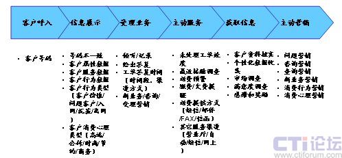 在上面的流程中,將一次客戶接觸,轉(zhuǎn)變?yōu)橐淮稳娴目蛻艋?dòng)機(jī)會(huì),通過對(duì)客戶信息360度的洞察和客戶的互動(dòng)溝通,在為客戶提供基本服務(wù)的同時(shí),根據(jù)客戶的基本資料、歷史消費(fèi)數(shù)據(jù)等,挖掘客戶的隱性需求,從而有選擇的開展客戶關(guān)懷、客戶信息收集、客戶維系、主動(dòng)營(yíng)銷活動(dòng)。下面以一個(gè)電信運(yùn)營(yíng)商的客戶呼入流程為例,說明在一個(gè)以客戶為中心的客戶接觸流程中,坐席代表可以開展的客戶接觸活動(dòng)(圖4)。
