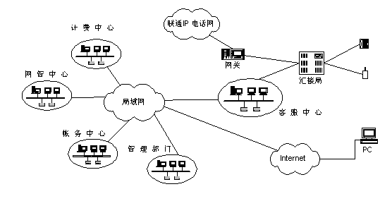 聯(lián)通北京分公司將客戶服務(wù)系統(tǒng)與現(xiàn)有計費、營業(yè)、帳務(wù)系統(tǒng)進(jìn)行組織,形成了一個有機(jī)的結(jié)合體,能夠充分發(fā)揮出現(xiàn)有系統(tǒng)的優(yōu)勢?蛻舴⻊(wù)系統(tǒng)從營業(yè)帳務(wù)系統(tǒng)提取相關(guān)用戶資料,建立客戶服務(wù)的系統(tǒng)資料庫,從計費系統(tǒng)提取相關(guān)用戶話費資料等供查詢使用。同時客服系統(tǒng)還將與北京聯(lián)通現(xiàn)有的計費、營業(yè)、帳務(wù)、網(wǎng)管等相關(guān)系統(tǒng)以及Internet相連,提供業(yè)務(wù)處理和用戶自助服務(wù)等業(yè)務(wù)。本客服中心通過2對路由器和DDN專線與聯(lián)通北京分公司現(xiàn)有的局域網(wǎng)(包括管理部門、網(wǎng)管中心、計費中心、帳務(wù)中心等相關(guān)系統(tǒng))連接,并通過該局域網(wǎng)訪問Internet。