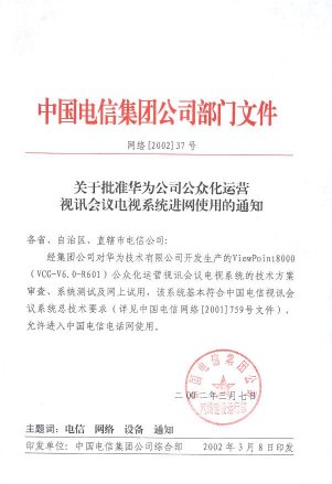 日前,在中國電信集團公司組織的“新視通”公眾化視訊運營許可證的測試中,華為公司具有完全自主知識產(chǎn)權(quán)的“視點通”ViewPoint 8000綜合視訊系統(tǒng)以其先進的設(shè)計理念和卓越的產(chǎn)品性能,順利通過測試,成為業(yè)界第一個獲得中國電信集團公司公眾視訊運營許可證的產(chǎn)品。同時華為公司也成為目前業(yè)界唯一獲此認證的設(shè)備供應(yīng)商。