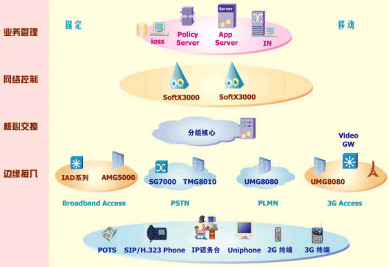 普通用戶可通過智能分組話音終端、多媒體終端接入,通過接入媒體網(wǎng)關(guān)、綜合接入設備(IAD)來滿足用戶的語音、數(shù)據(jù)和視頻業(yè)務的共存需求。