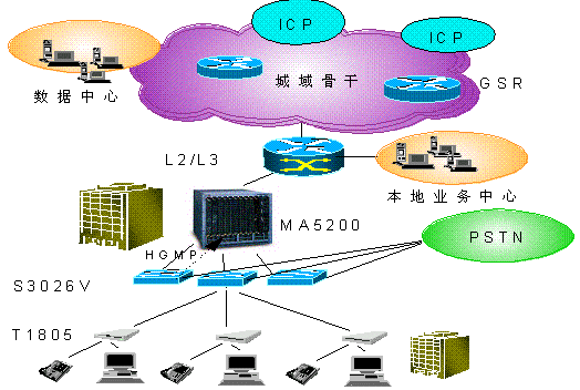 另外,Quidway S3026V可與華為公司MA5200等組網(wǎng),通過HGMP(Huawei Group Management Protocal)華為組管理協(xié)議,S3026V與華為MA5200、S3526等上行管理設(shè)備共同提供寬帶接入網(wǎng)的整網(wǎng)解決方案,實(shí)現(xiàn)對Quidway(R) S3026V的集中管理,為用戶提供更廣泛、更豐富的業(yè)務(wù)功能,充分體現(xiàn)華為公司在寬帶網(wǎng)絡(luò)上具有的“可運(yùn)營、可管理、可維護(hù)”優(yōu)勢。 如圖2所示: