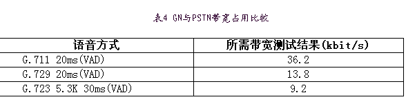 為進(jìn)一步節(jié)省帶寬,又采用語音激活檢測技術(shù)(VAD)及舒適噪音生成(CNG)技術(shù),VAD技術(shù)只有當(dāng)檢測到語音處于活動(dòng)狀態(tài)時(shí),編碼器的輸出信號才被送到網(wǎng)絡(luò)上,因此節(jié)省了帶寬。而在靜音時(shí)段采用CNG技術(shù),生成與背景噪聲相匹配的較舒適的靜音,避免了用戶有不自然的交談感覺,保證通話質(zhì)量。實(shí)際測試結(jié)果如表4,采用G.72920ms打包+VAD技術(shù)節(jié)省了近75%的帶寬。