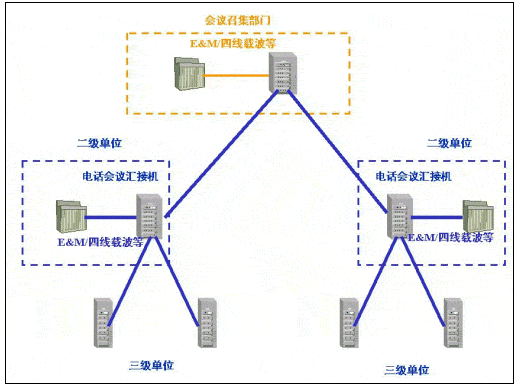 當前國內(nèi)許多行業(yè)由于行業(yè)的業(yè)務特點,在原有的電話網(wǎng)應用中,電話會議作為常用的交流手段發(fā)揮著重要作用。這些行業(yè)的電話會議業(yè)務,主要是通過電話會議匯接機的方式實現(xiàn):會議召集單位通過電話會議匯接機(以下簡稱匯接機)通過專線、撥號等方式連通下級單位(以下簡稱二級單位)的匯接機,二級單位的匯接機通過專線、撥號等方式連通所轄單位(以下簡稱三級單位)的會場電話。這樣通過多級匯接機級連的方式實現(xiàn),主持單位和二、三級單位間的電話網(wǎng)連通,利用匯接機實現(xiàn)廣播、三方通話、調(diào)度發(fā)言單位等會議功能。圖一模擬電話體制下的電話會議實現(xiàn)方案