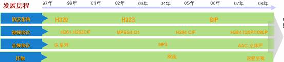 多媒體會(huì)議主要提供語(yǔ)音、視頻、數(shù)據(jù)的融合會(huì)議解決方案。傳統(tǒng)的多媒體會(huì)議在2001年前主要是專(zhuān)線(E1/ISDN)H.320的視頻會(huì)議系統(tǒng)。隨著寬帶(LAN/ADSL)的發(fā)展,2002年至2007年主要是H.323的視頻會(huì)議系統(tǒng),同時(shí)兼容H.320的專(zhuān)線視頻會(huì)議系統(tǒng)。2007年前音頻的主要是8k采樣的G.7xx協(xié)議,2007年后寬頻語(yǔ)音AAC-LD已經(jīng)普遍使用。視頻2007年前主要是4CIF格式以下的標(biāo)清系統(tǒng),2007年后H264