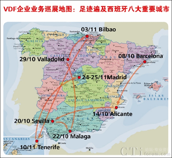 Vodafone 09企業(yè)業(yè)務(wù)巡展是Vodafone攜手10家重要合作伙伴和28家SP針對西班牙企業(yè)用戶舉行的一個大型巡展,整個展會歷時(shí)兩個月,以西班牙的經(jīng)濟(jì)文化中心Barcelona為起點(diǎn),途徑Alicante、Sevilla、Malaga、Valladolid、Bilbao、Tenerife,最后于11月24-25號在西班牙首府Madrid隆重謝幕。共有1萬多人、五千多家企業(yè)參加了本次展會,受邀企業(yè)覆蓋到金融、貿(mào)易、電信、交通、建筑、服務(wù)、醫(yī)療保健等重要行業(yè),其中大都為移動辦公需求旺盛需要保持實(shí)時(shí)協(xié)同的中小型企業(yè)。展會期間,華為歐洲地區(qū)部多位高層領(lǐng)導(dǎo)親臨展會現(xiàn)場指導(dǎo)工作,包括Vodafone系統(tǒng)部副總Edward Chan和張文林、代表處代表謝新平、歐洲軟件業(yè)務(wù)部領(lǐng)導(dǎo)林劼。領(lǐng)導(dǎo)們和客戶親切交流,并廣泛了解了其他SP展出的多項(xiàng)創(chuàng)新業(yè)務(wù)。