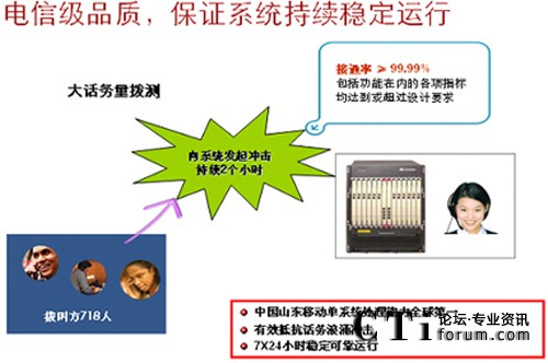 華為聯(lián)絡(luò)中心系統(tǒng)具有高穩(wěn)定性、高可靠性、易擴(kuò)展性和可維護(hù)性。這主要源于華為對(duì)電信網(wǎng)絡(luò)現(xiàn)狀與演進(jìn)的理解,源于華為擁有固定、移動(dòng)和IP三個(gè)網(wǎng)絡(luò)方面綜合實(shí)力。華為數(shù)以千計(jì)的核心平臺(tái)開(kāi)發(fā)測(cè)試人員,幾十種極端環(huán)境(如超大話務(wù)量、溫差、濕度、鹽堿度、缺氧等),磨礪出的是世界級(jí)的高品質(zhì)。麥加朝圣10KM內(nèi)密集200萬(wàn)移動(dòng)用戶(hù),大部分為國(guó)際漫游,整齊劃一的用戶(hù)行為,形成連日多波話務(wù)尖峰,網(wǎng)絡(luò)受不均衡沖擊,系統(tǒng)容易雪崩。使用華為方案STC連續(xù)四年征服HAJJ期間話務(wù)高峰,告別系統(tǒng)每逢朝圣就癱瘓歷史。正是繼承了這樣的DNA,我們?cè)谀骋苿?dòng)運(yùn)營(yíng)商聯(lián)絡(luò)中心系統(tǒng)單點(diǎn)實(shí)測(cè)BHCC1200K,每天平均呼叫量為600萬(wàn)次,一套系統(tǒng)支撐著2000多座席和近8000路IVR。