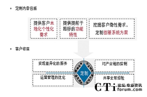 可定制服務(wù)主要體現(xiàn)在三個(gè)層面,一個(gè)是定制化服務(wù),通過(guò)全國(guó)10多個(gè)本地定制開(kāi)發(fā)中心對(duì)客戶(hù)提供貼身二次開(kāi)發(fā)服務(wù),支撐客戶(hù)更精細(xì)運(yùn)營(yíng)其客服系統(tǒng),另一個(gè)是定制化路標(biāo),定制化創(chuàng)新系統(tǒng)方案,即通過(guò)華為MKT、行銷(xiāo)、開(kāi)發(fā)部門(mén)對(duì)客戶(hù)價(jià)值需求的深度分析,將客戶(hù)需求去粗存精、去偽存真、由表及里、由此及彼“定制提煉”出來(lái),成為我們產(chǎn)品和方案的路標(biāo)。