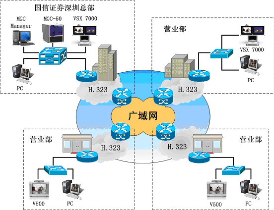 國信證券有限責(zé)任公司為全國性大型綜合類證券公司,總部在深圳,在全國二十一個(gè)城市擁有二十多家營業(yè)部及服務(wù)網(wǎng)點(diǎn)。隨著國信證券規(guī)模的不斷擴(kuò)大和內(nèi)外交流的增加,公司領(lǐng)導(dǎo)希望借助視頻會(huì)議的高效、快捷等特點(diǎn),提高管理效率、統(tǒng)一管理、降低企業(yè)的管理運(yùn)作成本、減少公司的巨額通訊費(fèi)用和差旅費(fèi)用。