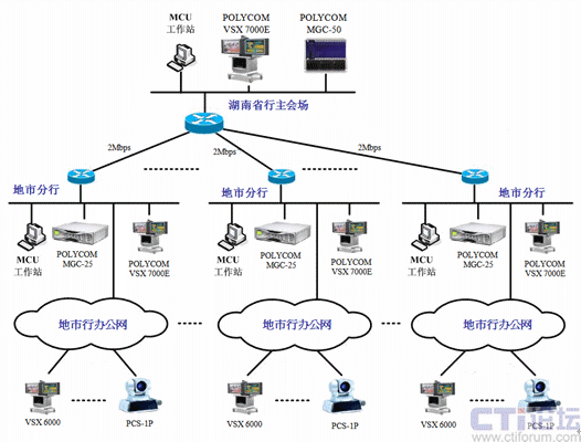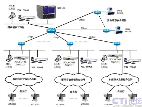 在株洲、邵陽和永州市行采用級聯(lián)的方式來實現(xiàn)。具體實現(xiàn)方式為:VSX 7000E則和地市行的MGC-25通訊,并且MGC-25負責(zé)其縣支行終端的接入,同時用MGC-50和MGC-25的端口級聯(lián),采用這種連接方式就可以實現(xiàn)從省行-地市行-縣支行的三級網(wǎng)視頻會議的召開。