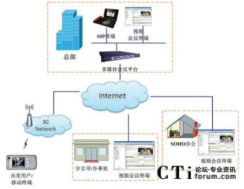 本系統(tǒng)通常將會議系統(tǒng)安裝于公司總部,應用服務器與媒體服務器全部實現(xiàn)雙掛,同時接入公司內網和公網。各分公司安裝的視頻數(shù)據會議終端、SIP話機,通過Internet或專線聯(lián)接到總部會議服務器的公網出口。公司內部辦公室、會議室的視頻數(shù)據會議終端、SIP話機,通過局域網連接到會議服務器。會議服務器通配合IPPBX、語音網關,接入外線,實現(xiàn)普通電話和手機接入會議。全面支持IP電話和模擬電話。當遠程用戶沒有條件進行視頻數(shù)據會議時,可以單獨使用音頻,或者音頻+數(shù)據的方式進行會議,以保證在網絡條件很差時也能夠進行協(xié)同辦公。本系統(tǒng)采用不同級別的IPPBX或語音網關直連FXO口接入PSTN市話,保留了傳統(tǒng)的模擬電話線路。