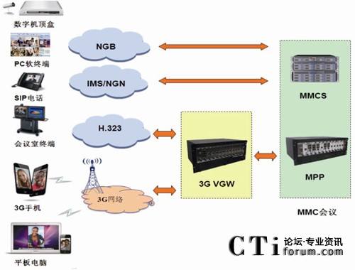 鑒于傳統(tǒng)視頻會議只能在固定地點、專用線路,通過專用設(shè)備召開語音和視頻會議的局限性。3G移動視頻會議解決方案實現(xiàn)了將會議拓展到整個互聯(lián)網(wǎng)和移動網(wǎng)絡(luò),用戶隨時隨地可以使用3G手機(jī)和PC,通過互聯(lián)網(wǎng)、移動網(wǎng)絡(luò)即可便捷地接入到現(xiàn)有會議系統(tǒng)中,真正實現(xiàn)跨越地域、空間的全方位會議。CTI論壇編輯