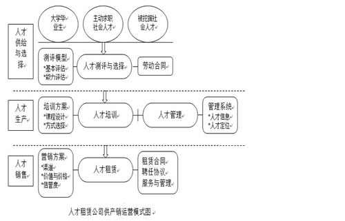 作為人才與用人單位的橋梁,人才租賃公司的運營模式直接影響到人才租賃這種就業(yè)形式和用人方式的發(fā)展,也關乎整個勞動力市場的運作。人才租賃公司的生存和發(fā)展主要依靠對人才的經(jīng)營,人才雖然與普通產(chǎn)品具有較大差別,但對人才租賃公司來講同樣需要經(jīng)歷基本“供給—生產(chǎn)—銷售”等環(huán)節(jié)。具體來講,可以將人才租賃公司的供產(chǎn)銷運營模式用下圖表示。