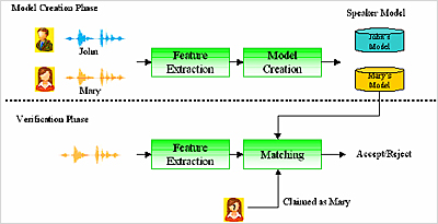 而語者驗證(Speaker Verification)技術(shù),如下圖所示,我們亦可稱之為語者認證(Speaker Authentication)或是語者偵測(Speaker Detection),主要是用來鑒定一已知身份的說話者其宣稱之身份的真實性,利用擷取說話者的聲紋特征,我們可以從事先儲存的語者聲紋資料庫中,取出該宣稱身份的語者聲紋模型,并且和說話者輸入的聲音做比對,由于系統(tǒng)會先獲知該使用者表明的身份(如小美),所以這會造成兩種可能的判斷錯誤,其中一種是錯誤接受(False Accept),即說話者為一冒充者(Imposter)但被系統(tǒng)誤認為其所宣稱的身份,另外一種是錯誤拒絕(False Reject),即系統(tǒng)將真實身份的說話者誤判為冒充者。