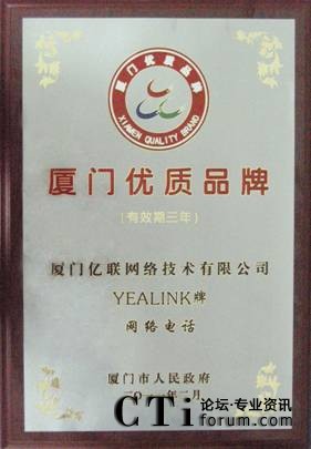 CTI論壇(ctiforum)3月4日消息(記者 潘婷婷): 2011年3月3日,中國最佳IP話機提供商,暢銷歐美IP通信終端市場—億聯(lián)公司(Yealink)旗下全系列產品近日被廈門市政府授予2010年“廈門市優(yōu)質品牌”稱號,為Yealink品牌建設添上了重要的一筆。CTI論壇報道