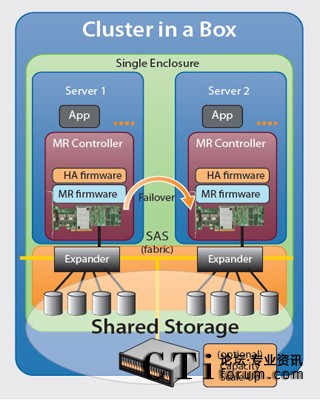 HA-DAS 解決方案,該方案包含一個布置在單一機箱中的雙服務器 3U 系統(tǒng),使用 LSI® MegaRAID® 6Gb/s