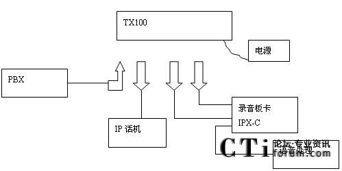 IP話機的錄音示意圖和圖1-4 E1/T1數(shù)字線錄音示意圖類似。不過此時PBX與IP話機之間的連線改成網(wǎng)線(RJ45)了。并且在兩個設備之間多了個并接設備TX100,其示意圖如下: