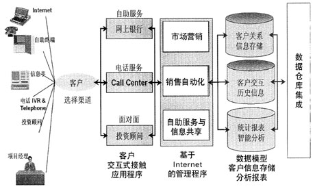 針對(duì)商業(yè)銀行面臨的挑戰(zhàn)和真實(shí)的需要,Oracle開(kāi)發(fā)了面向銀行業(yè)的CRM解決方案。該解決方案提供全方位、統(tǒng)一的多渠道協(xié)同的客戶交互服務(wù)入口,包括網(wǎng)上自助服務(wù)、網(wǎng)上他助服務(wù)(通過(guò)Call Center在線指導(dǎo)客戶理財(cái)或提供投資建議)、電話自助服務(wù)、電話專(zhuān)家服務(wù)、電話智能市場(chǎng)推銷(xiāo)和銷(xiāo)售等,F(xiàn)場(chǎng)服務(wù)則提供客戶經(jīng)理與客戶面對(duì)面交流的能力,包括知識(shí)共享(金融市場(chǎng)信息、銀行產(chǎn)品信息和各業(yè)務(wù)部門(mén)發(fā)布的信息等)、銀行信息的及時(shí)獲取、產(chǎn)品和服務(wù)介紹、適時(shí)的投資建議、客戶交易行為追蹤、通過(guò)智能化工具提供專(zhuān)家服務(wù)、銷(xiāo)售機(jī)會(huì)管理等,允許重點(diǎn)客戶通過(guò)Web、電話或與客戶經(jīng)理/投資顧問(wèn)面談等方式,提供更靈活的服務(wù)選擇和更及時(shí)的服務(wù),以保留大客戶群,增長(zhǎng)股東利益。