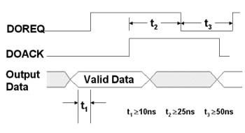 mode),相較于序列式的數(shù)據(jù)傳輸,并行傳輸提供了簡(jiǎn)單且更高速的數(shù)據(jù)傳輸方式,不過其技術(shù)關(guān)鍵在于發(fā)送端與接收端之間的時(shí)序差問題,因此,針對(duì)此時(shí)序差的問題,高速數(shù)字I/O卡需提供握手模式,讓兩張卡以交握信號(hào)確保數(shù)據(jù)的正確性。下圖為數(shù)據(jù)輸出的時(shí)序圖: