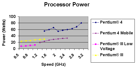 一個(gè)32W的功率讓一顆Pentium 4的處理器可以跑到1.7GHz,要增加處理器的速度則讓我們必須增加散熱片的大小,或是降低最大操作溫度、增強(qiáng)吹風(fēng),或者是這些方法中的某種組合。下一代的設(shè)計(jì)目標(biāo)會(huì)是達(dá)到3GHz的P4處理器,那表示我們必須要能處理65W的熱能。下一代的卡板由于將具備更加多樣豐富的功能與規(guī)格,勢(shì)必難以在增加散熱片大小上做文章,多出來(lái)的33W將必須通過(guò)增加風(fēng)速和降低最大操作溫度來(lái)達(dá)成。每分鐘450英尺的風(fēng)速,散熱片熱阻0.45°C/W,周邊操作溫度可被降到40°C。如果給定這樣的條件,處理器最大的功率將是