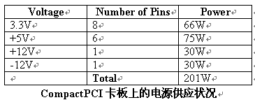 CompactPCI卡板透過(guò)J1/J2的連接器來(lái)接收電源。有8個(gè)3.3V、6個(gè)5V、1個(gè)+12V、1個(gè)-12V的電源接腳。這些接腳供應(yīng)1安培 IEC61076-4-101規(guī)格的電。每個(gè)接腳一安培的限制是保守的,而且某種程度上會(huì)誤導(dǎo)讓人以為所有的接腳可以在周邊溫度70°C的狀況下去接一安培的電流。在現(xiàn)實(shí)狀況中并不是所有連接器中的接腳都負(fù)載到最大的電流量,事實(shí)上大部分的CompactPCI接腳都是負(fù)載在以毫安為單位的電流范圍中。70°C一安培的限制,是基于流過(guò)接腳的電流所產(chǎn)生的熱。當(dāng)電流增加時(shí),也加大了跨過(guò)接腳的電位差。產(chǎn)生的熱是一種電壓和電流的函數(shù),電壓和電流的增加會(huì)使連接器接腳的溫度上升。在CompactPCI中有最顯著電流量的的接腳,是電源供應(yīng)器接腳。如果設(shè)計(jì)者假設(shè)J1/J2連接器中的其它所有接腳都有電流負(fù)載,每一個(gè)接腳的最大電流則會(huì)是在40°C 2.5Amps, 這個(gè)信息可以在IEC61076-4-101的規(guī)格中的4.2.3中被找到。在每個(gè)接腳2.5安培的條件下,板卡可取得的功率大小如下表所示,此表顯示出卡板的設(shè)計(jì)者最多可以從J1/J2連接器中拉出200Watts的電。