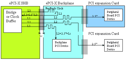 由于加了PCI-X,底板上的時(shí)鐘的長(zhǎng)度就成為關(guān)鍵了。規(guī)范的作者要定義應(yīng)能與各種底板互操作的SHB。這挑戰(zhàn)是在SHB上的PCI-X接口需要一個(gè)具有相等于底板上時(shí)鐘走線長(zhǎng)度延時(shí)的反饋時(shí)鐘。這反饋時(shí)鐘是在底板上并且它的長(zhǎng)度是以從SHB插槽到PCI插板插槽的時(shí)鐘的長(zhǎng)度為基礎(chǔ)的。在下面畫(huà)的圖中,從橋到三個(gè)目的地中任何一個(gè)的時(shí)鐘距離是相同長(zhǎng)度的。
