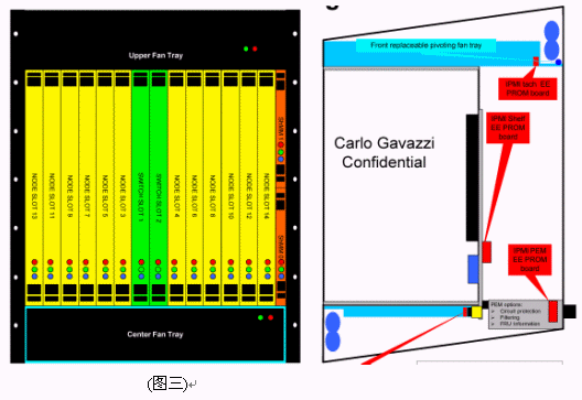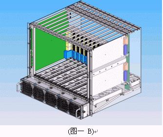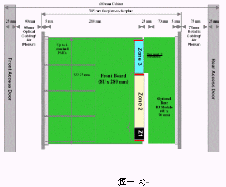 我們可以看到當今市面上已有相關(guān)的零件商或系統(tǒng)商開發(fā)出14U或13U,12U的ATCA機箱。就ATCA機箱的型式來說可以分為直立型插卡與橫向型插卡兩種類型。直立式插卡機箱的標準為14槽(參考圖一B),而橫向型機箱因受限于機箱高度,所以視其高度決定槽數(shù)的多少。 ATCA的架構(gòu)主要包括以下部分:正面插槽,RTM,PEM,背板,CMMs,散熱系統(tǒng)。(參考圖一與圖二)