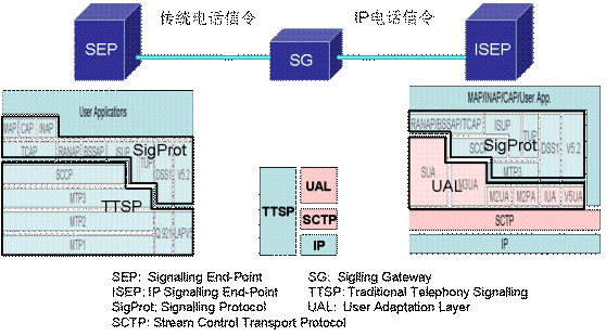 電話網(wǎng)中的一個信令節(jié)點(diǎn)與IP網(wǎng)中的一個信令節(jié)點(diǎn)不能直接相連,它們之間的相互通信需要依靠一個叫做信令網(wǎng)關(guān)(Signaling Gateway,SG)的中間設(shè)備來進(jìn)行。從IP網(wǎng)絡(luò)的角度來看,這個信令網(wǎng)關(guān)有時也叫做應(yīng)用服務(wù)器通信設(shè)備,因為在UAL中常把上述的IP信令節(jié)點(diǎn)叫做應(yīng)用服務(wù)器(Application