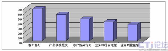 那么保險(xiǎn)企業(yè)希望通過進(jìn)一步深入開展電話中心信息化工作得到哪些效用或者有價(jià)值的信息呢,我們認(rèn)為,電話中心為保險(xiǎn)企業(yè)所提供的信息中最重要的依然是“客戶的聲音”,具體來說,包括客戶喜好和客戶購(gòu)買行為等,其次便是業(yè)務(wù)流程信息。企業(yè)管理層對(duì)來自電話中心的不同信息的關(guān)注程度如下圖所示。