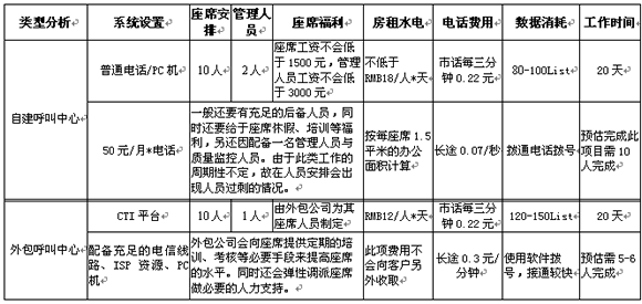 以上是以Telemarkering項目舉例,如需完成一萬條數(shù)據(jù)的外呼工作,自建呼叫中心與外包型呼叫中心的區(qū)別。以上數(shù)字只是提現(xiàn)在設備、人員效率等方面問題,另定期的人員培訓及相關系統(tǒng)的維護將是費用產生的一大因素。其實在項目的實施過程中發(fā)生的費用只是一部分,從公司的運營角度看是可以節(jié)省很大的精力(例如:人員招聘、培訓、福利待遇)及運營時間。