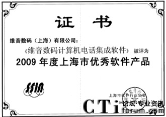 CTI論壇(ctiforum)10月19日消息: 金秋十月,捷報(bào)頻傳,由上海市軟件行業(yè)協(xié)會(huì)開(kāi)展的2009年度上海明星軟件企業(yè)評(píng)選結(jié)果出爐,維音數(shù)碼不僅榮登:“2009年度上海明星軟件企業(yè)(經(jīng)營(yíng)型)”和“2009年度上海明星軟件企業(yè)(創(chuàng)新型)”獲獎(jiǎng)榜單,維音數(shù)碼自主研發(fā)的軟件產(chǎn)品VisionCTI(計(jì)算機(jī)電話集成系統(tǒng))更是被評(píng)定為“2009年度上海市優(yōu)秀軟件產(chǎn)品獎(jiǎng)”。