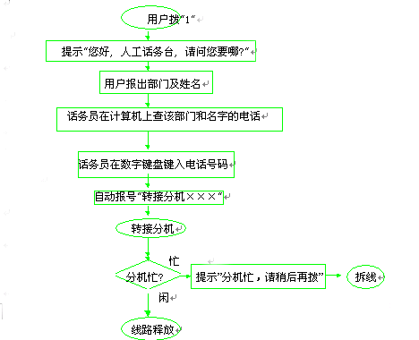 話務(wù)員不需要說話, 系統(tǒng)在所有必要之處都有提示音, 話務(wù)員只要在數(shù)字鍵盤上鍵入部門號(hào)"0××"和電話號(hào)碼"2××"。