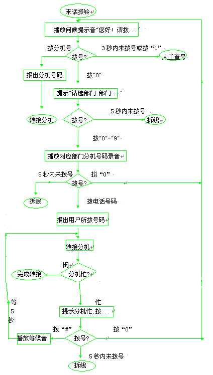 來話首先被接至自動(dòng)查號(hào)接續(xù)系統(tǒng), 自動(dòng)系統(tǒng)的工作流程如下: