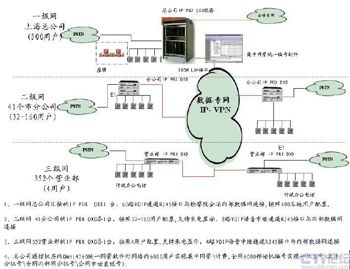 套Omni PCX Office(面向中小型機(jī)構(gòu)的通信平臺)系統(tǒng)分別為4-160 用戶作為分支交換節(jié)點(diǎn)。全網(wǎng)總計多達(dá)6000