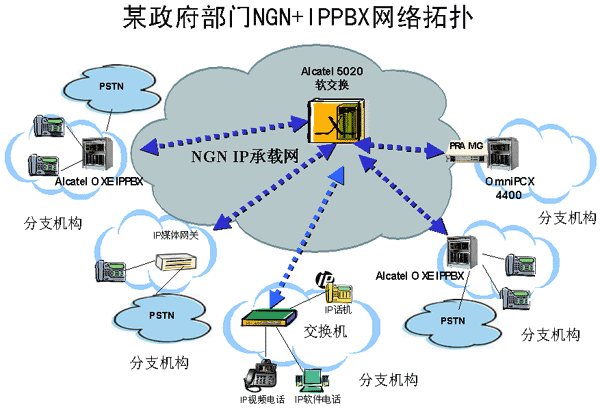 上海貝爾阿爾卡特提出的用NGN整合IP PBX的解決方案,在政府、郵政、酒店、跨國企業(yè)等領(lǐng)域得到了很多成功的應(yīng)用,下面以國家政府某部門的部署方案為例來詳細介紹NGN+IP