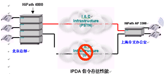 人們也許會(huì)問(wèn),IP語(yǔ)音(VoIP)是否足夠可靠?如果IP網(wǎng)絡(luò)上的信令通道出現(xiàn)故障,HiPath平臺(tái)仍將保證對(duì)各接入點(diǎn)的控制,從而提供了可靠的信令存活性能(Signaling Survivability)。在下面的圖例中,當(dāng)企業(yè)IP網(wǎng)絡(luò)出現(xiàn)某些問(wèn)題后,信令通道轉(zhuǎn)移到了公共交換電話(huà)網(wǎng)絡(luò)(PSTN)之上。