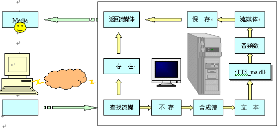 瀏覽器端(Explorer)發(fā)出瀏覽請求,網(wǎng)站服務(wù)器(IIS)根據(jù)請求查找流媒體(音頻流)文件,如有,則將流媒體返回客戶端,并啟動(dòng)客戶端的MS media player播放流媒體。若沒有,則向語音服務(wù)器(jTTS Service)發(fā)出合成請求,并將所需合成的文本通過Socket接口傳送至語音服務(wù)器;語音服務(wù)器響應(yīng)網(wǎng)站服務(wù)器的合成請求后,將調(diào)用jTTS合成技術(shù)進(jìn)行語音合成,并調(diào)用WMF SDK將生成的音頻文件轉(zhuǎn)換成流媒體格式ASF;通過Socket接口返回IIS服務(wù)器端后,將此流媒體文件存儲到指定的Web目錄,同時(shí)將流媒體返回瀏覽器端,啟動(dòng)MS media player播放。其流程如下: