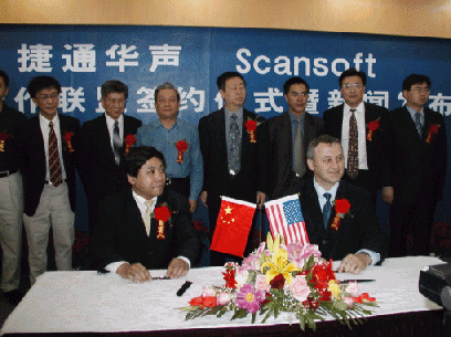 2004年5月20日,北京捷通華聲語音技術有限公司與美國Scansoft公司(Nasdaq:SSFT)宣布就語音技術全面合作達成戰(zhàn)略聯(lián)盟,雙方在北京正式簽署了合作協(xié)議,并舉行了新聞發(fā)布會。