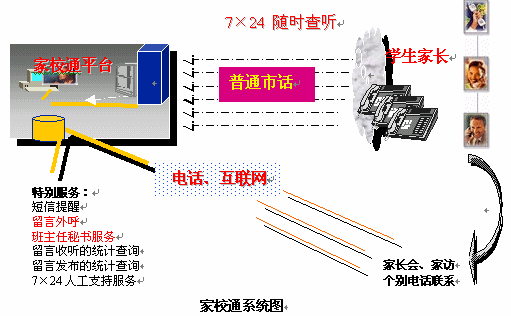 捷通華聲從關(guān)愛青少年成長出發(fā),提出了應(yīng)用于教育領(lǐng)域溝通平臺"家校通"系統(tǒng)的語音服務(wù)解決方案。家校通系統(tǒng)是一個(gè)融合了語音合成、計(jì)算機(jī)網(wǎng)絡(luò)集成綜合服務(wù)、互聯(lián)網(wǎng)、數(shù)據(jù)庫等多種先進(jìn)IT技術(shù)為一體的新一代家校聯(lián)系工具。它充分利用互聯(lián)網(wǎng)與目前最為普及的公眾電話等資源,為學(xué)校提供多樣化的信息發(fā)布渠道,同時(shí)強(qiáng)大的7×24小時(shí)的留言發(fā)布和查聽服務(wù)功能,為老師和家長提供一種全新、高效、便捷的交流方式,大大提高了家長的滿意度,提升了學(xué)校的管理實(shí)力。