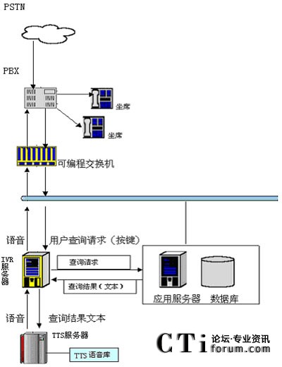 用戶撥打統(tǒng)一特服號(hào)碼進(jìn)入客戶服務(wù)系統(tǒng),經(jīng)過(guò)自動(dòng)語(yǔ)音系統(tǒng)提示,選擇公共信息查詢(xún)項(xiàng)目。用戶可以通過(guò)電話提交他的查詢(xún)請(qǐng)求(比如使用按鍵方式),IVR服務(wù)器收到請(qǐng)求后會(huì)向其他應(yīng)用服務(wù)器提交此查詢(xún)請(qǐng)求,當(dāng)IVR得到查詢(xún)結(jié)果后,他會(huì)將文本形式的查詢(xún)結(jié)果交給jTTS服務(wù)器,jTTS服務(wù)器會(huì)返回查詢(xún)結(jié)果的語(yǔ)音形式,最終語(yǔ)音會(huì)在坐席上播放,用戶就可以聽(tīng)到他剛才所要查詢(xún)的信息。