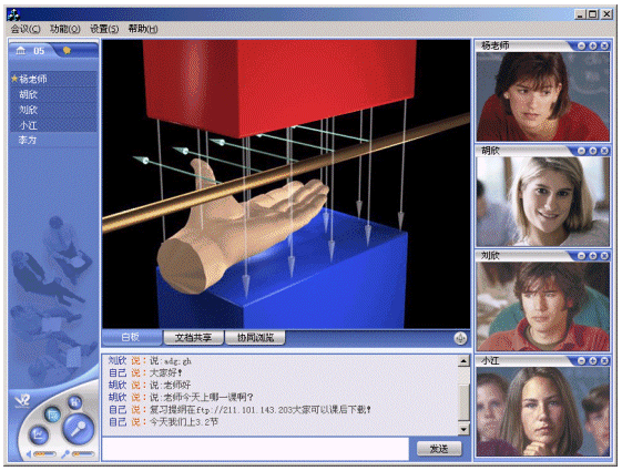 應(yīng)用V2 遠程教育平臺,教學(xué)和遠程培訓(xùn)都可以在線進行。學(xué)生和教師利用各自的客戶端通過網(wǎng)絡(luò),進入一個虛擬課堂,在教師與學(xué)生、學(xué)生與學(xué)生之間建立起語音和視頻的雙向交流、課件教學(xué)、在線會話和白板溝通的環(huán)境,實現(xiàn)教學(xué)功能。