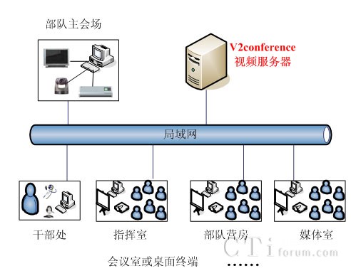 V2視頻會議系統(tǒng)建立在森警部隊專網(wǎng)的基礎(chǔ)上,各區(qū)作戰(zhàn)部隊會議室、指揮室和部隊營房會議均為光纖100M接入,每個中隊官兵營房都集中建立了培訓會議室,負責日常新兵的培訓教育。在現(xiàn)有的網(wǎng)絡基礎(chǔ)上構(gòu)建了V2視頻會議系統(tǒng),來滿足各個中隊和教導大隊的網(wǎng)絡會議和培訓需求。在每個節(jié)點會議室部署了電視、攝像頭和相關(guān)音響設(shè)備,目前已經(jīng)建成10多個網(wǎng)絡會議節(jié)點的遠程視頻培訓系統(tǒng)。