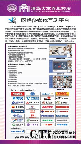 CTI論壇(ctiforum)5月3日消息(記者 張潔): 天行健,君子以自強(qiáng)不息,地勢坤,君子以厚德載物。2011年4月23日,清華大學(xué)迎來百年華誕。在建校百年之際,V2威速聯(lián)合母校----清華大學(xué)百年校慶辦展出了V2網(wǎng)絡(luò)多媒體互動平臺。V2威速眾多旗艦產(chǎn)品之一----V2網(wǎng)絡(luò)多媒體互動平臺始創(chuàng)于1999年清華大學(xué)第二屆“大學(xué)生創(chuàng)業(yè)比賽”。同年,V2威速于清華創(chuàng)業(yè)園創(chuàng)立,經(jīng)過11年的發(fā)展,V2威速已是中國值得信賴的多媒體通訊產(chǎn)品及解決方案供應(yīng)商。CTI論壇報(bào)道