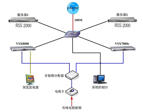 應(yīng)急備份:此系統(tǒng)中服務(wù)器1和服務(wù)器2互為備份;VSX8000和VSX7000e互為備份。RSS2000分配公網(wǎng)IP以便用戶(hù)通過(guò)互聯(lián)網(wǎng)接收直播和點(diǎn)播,兩臺(tái)服務(wù)器的地址同時(shí)發(fā)布在網(wǎng)站上。
