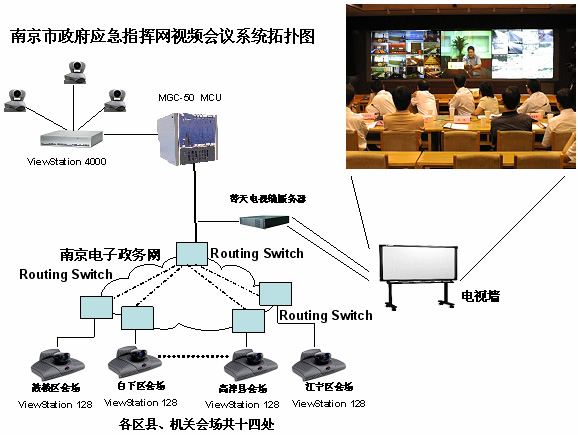 南京市政府利用南京市電子政務(wù)網(wǎng)的網(wǎng)絡(luò)基礎(chǔ),建立政府視頻會議指揮系統(tǒng),連接14個區(qū)縣政府及機(jī)關(guān),會議帶寬為768Kbps。利用本系統(tǒng)實現(xiàn)快速召集全市關(guān)鍵部門的會議。