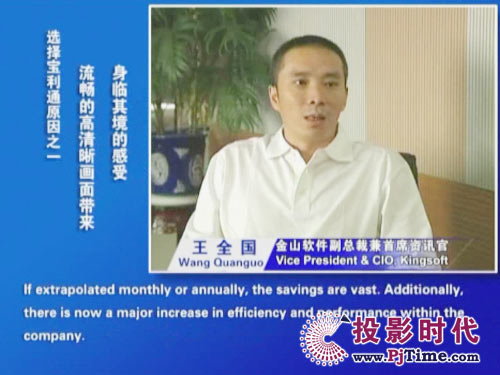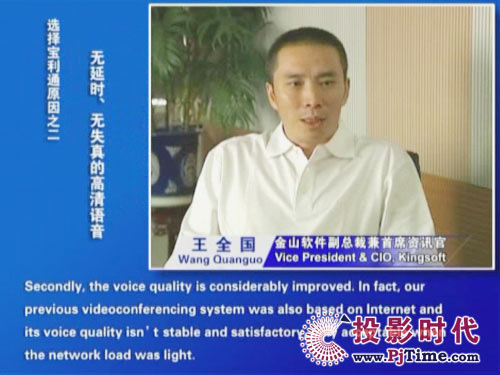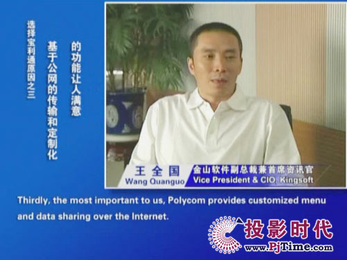 金山軟件副總裁兼首席資訊官王全國先生說道:“對于軟件行業(yè)來說,及時、高效的溝通是保持競爭優(yōu)勢的重要前提。相比之前使用的標清產品,寶利通高清視頻會議系統(tǒng),提供了完全不同的體驗,流暢的高清晰畫面猶如真實的面對面溝通。而且我們公司并沒有申請專線,所有的應用都是基于公網實現(xiàn)的。另一方面,新型全中文定制菜單的運用,令我們使用起來非常方便,這更提高了我們使用視頻通信手段實現(xiàn)異地溝通的熱情!