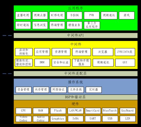 第三個中間件的可移植性可擴展性。芯片廠家或第三方廠家提供的解決方案主要包括:硬件解決方案;實時操作系統(tǒng)層,包括了設備/網(wǎng)絡驅(qū)動、文件系統(tǒng)、圖形/字體驅(qū)動、網(wǎng)絡協(xié)議;瀏覽器模塊,其他模塊需要機頂盒制造廠家進行研發(fā),而這些正是競爭差異和難度所在。產(chǎn)業(yè)要做大,就需要更多的廠家進入。理想的中間件客戶端基于操作系統(tǒng)層和硬件;使得更多的缺乏固網(wǎng)技術經(jīng)驗的廠家能夠加入到機頂盒產(chǎn)業(yè)鏈中,專注于機頂盒基礎研發(fā)和生產(chǎn),使得中間件移植的難度最小、時間最短